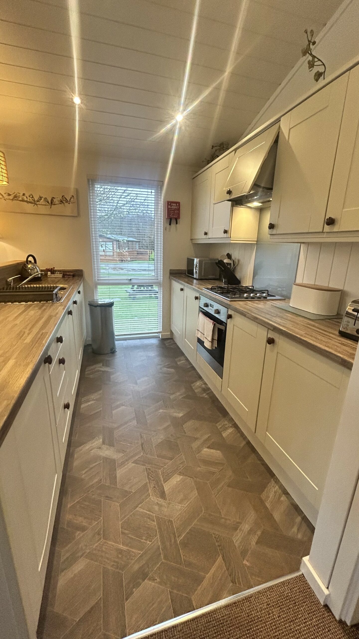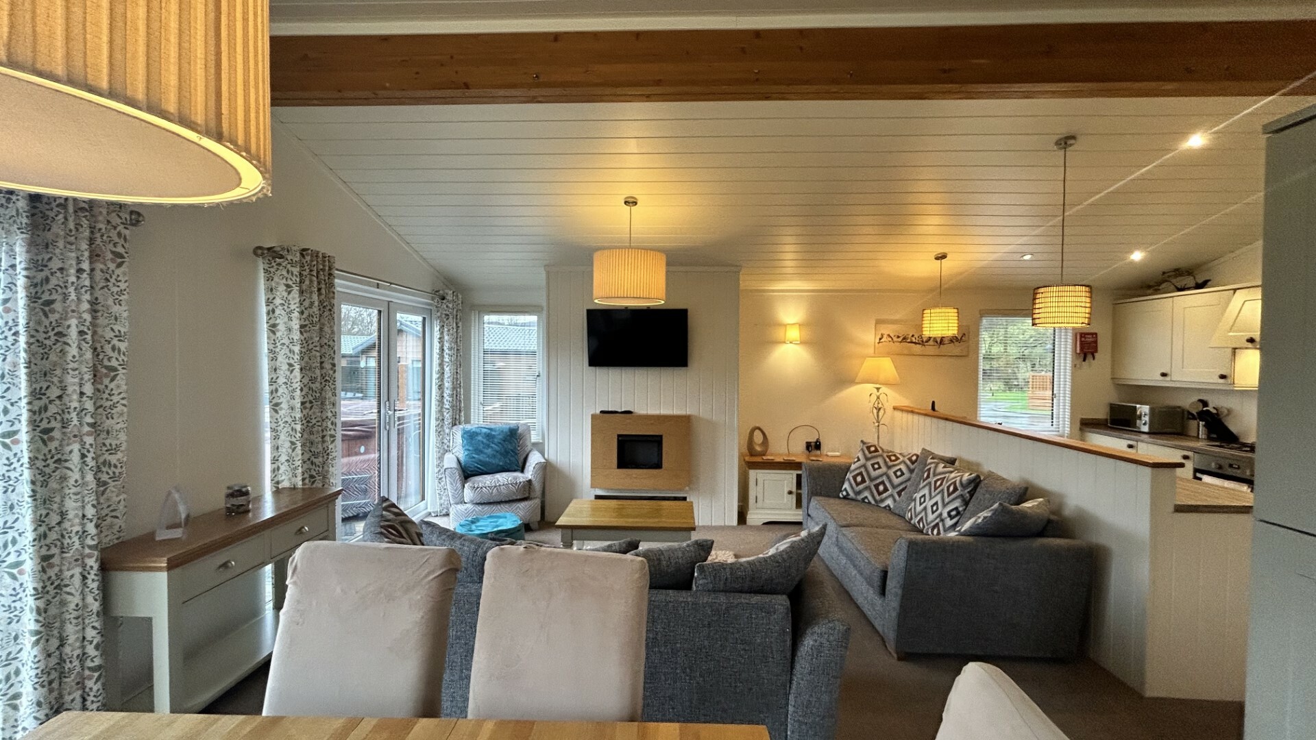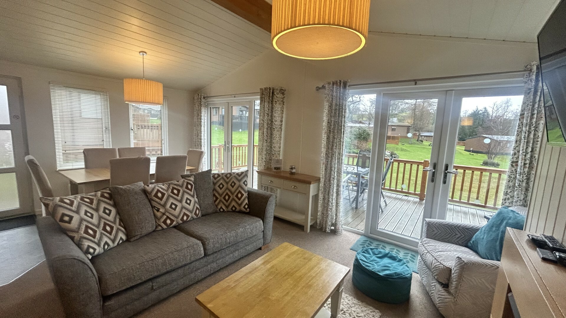 The bright fully fitted kitchen with shaker doors painted in contrasting shades makes the Plantation a spacious living area, ideal for entertaining. An open-plan lounge features double-opening French doors to the front aspect leading onto a fully decked area with hot tub. Large windows give natural light to an already fresh colour palette in the dining area with an extending table and six upholstered chairs.