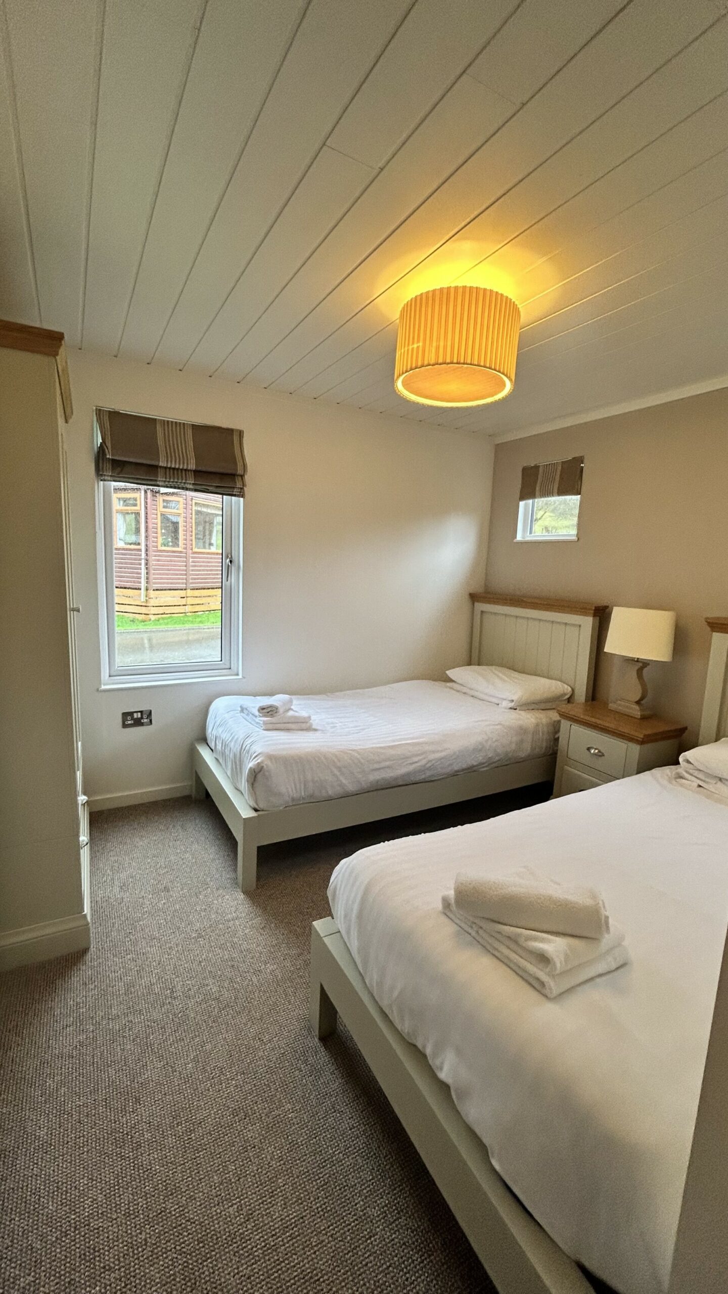 The freestanding bedroom furniture adds a flavour of the colonial to the large bedrooms. This double-width holiday lodge has 3 bedrooms and 2 bathrooms.
