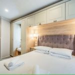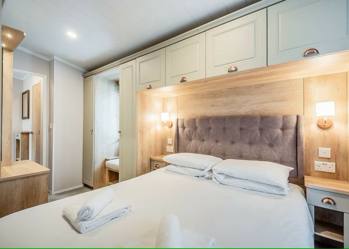 The master bedroom has a king-size bed with Duvalay™ mattresses and a padded headboard, the beds lift for additional storage space. There is a large wardrobe with additional over-bed storage too. Equipped with a dressing table with mirror and lighting. There is also an en-suite shower room off the main room. Wall-mounted TV.