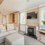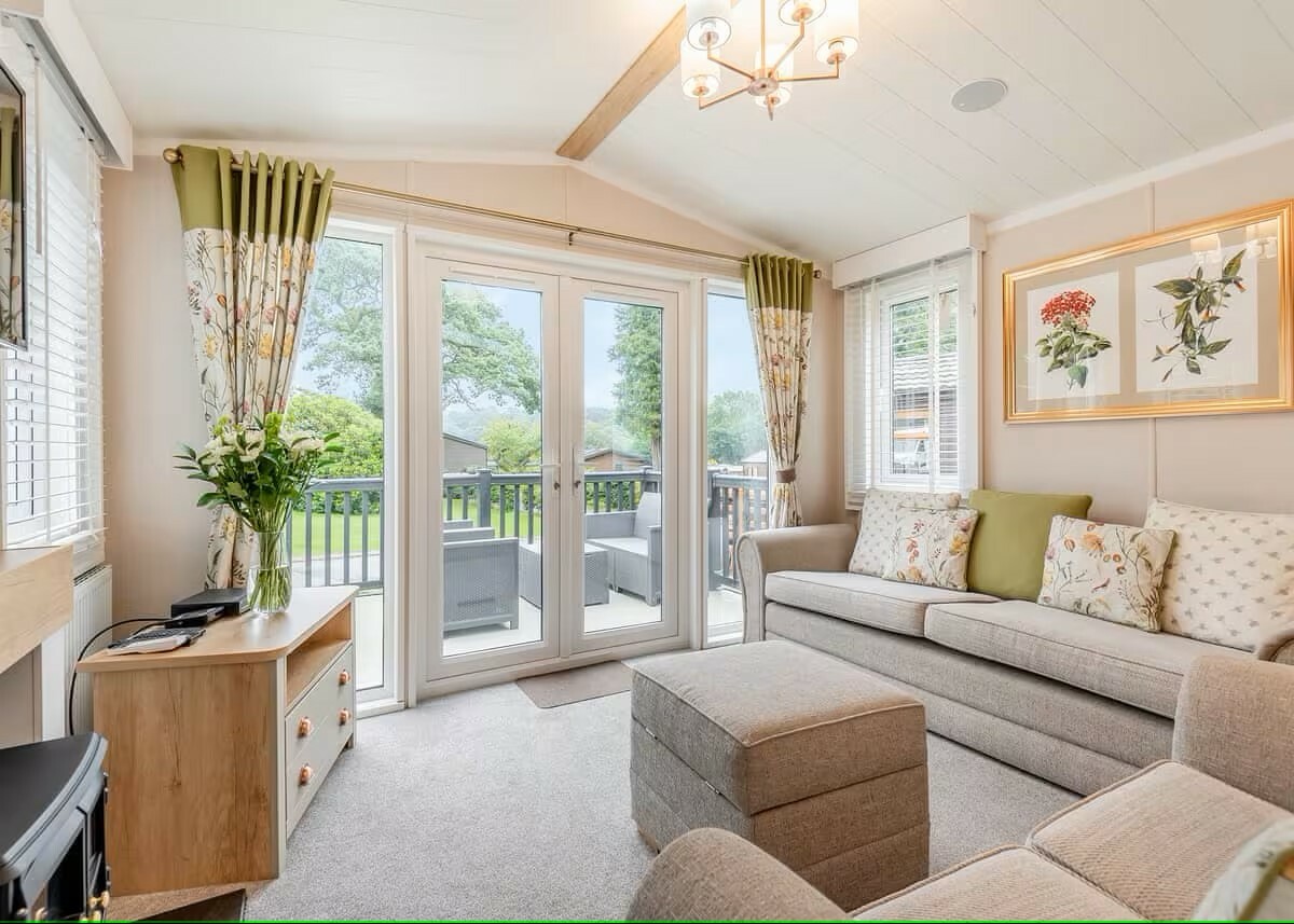 The open plan lounge-kitchen-dining area provides everything you need to relax or entertain, with two sofas for the family to relax, set around the TV on the wall and a log-burner-style electric fire. With double-opening doors to the front, there is plenty of natural light making the living area feel airy and welcoming.