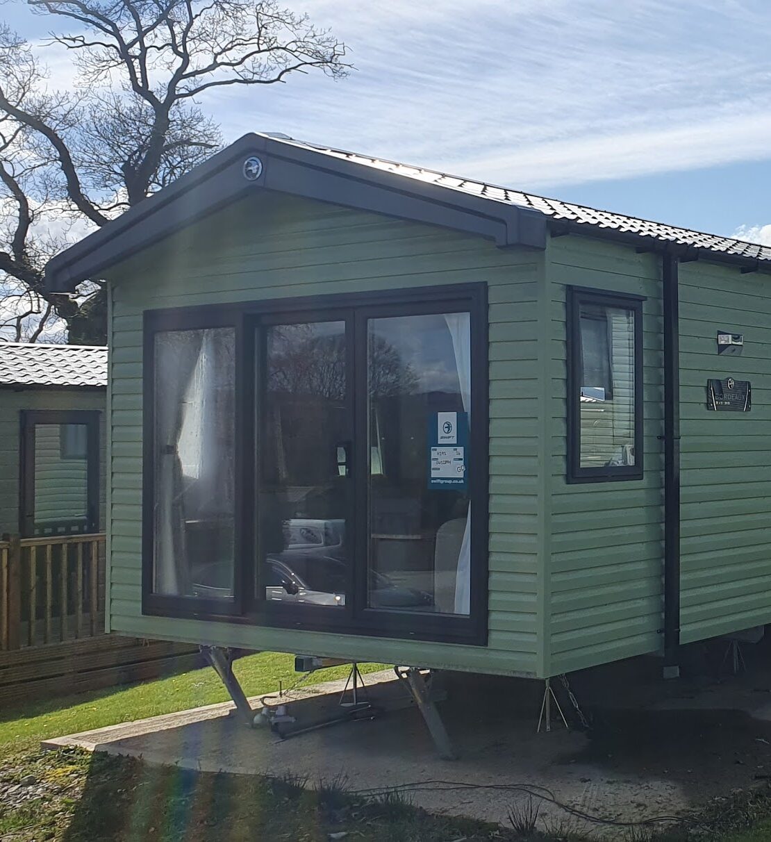 The Bordeaux is located at the top of Bala Caravan Park on an elevated pitch overlooking the park and the lake in the distance with unimpeded views of rolling hills at the back. There is also room for an extended decking at the back, should you want the freedom of not having to choose which views to take in when you are staying over.
