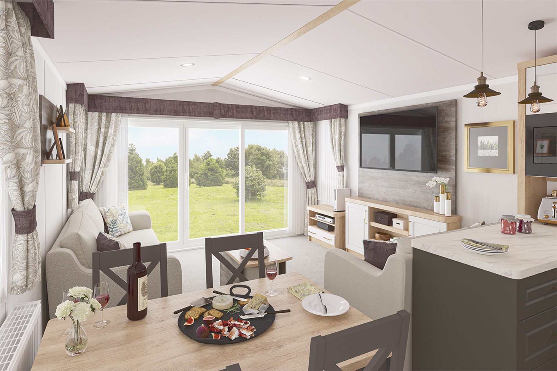 The new Swift Bordeaux is a perfect holiday home for anyone looking for a clean and contemporary interior, built to the highest possible standards. Swift are known to be innovators and pioneers in the holiday home industry with them being the first manufacturer to build all of their caravans up to residential specification. This is most apparent in the modern kitchen/dining area with black and gold accents, an extra window overlooking the kitchen and a slimline dishwasher. All this results in a light and airy living space where you can properly relax and decompress.